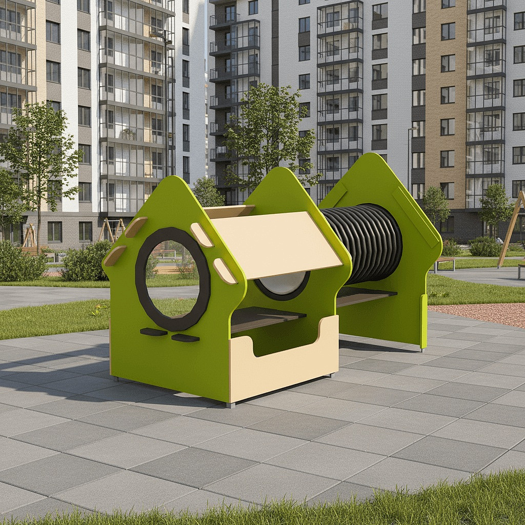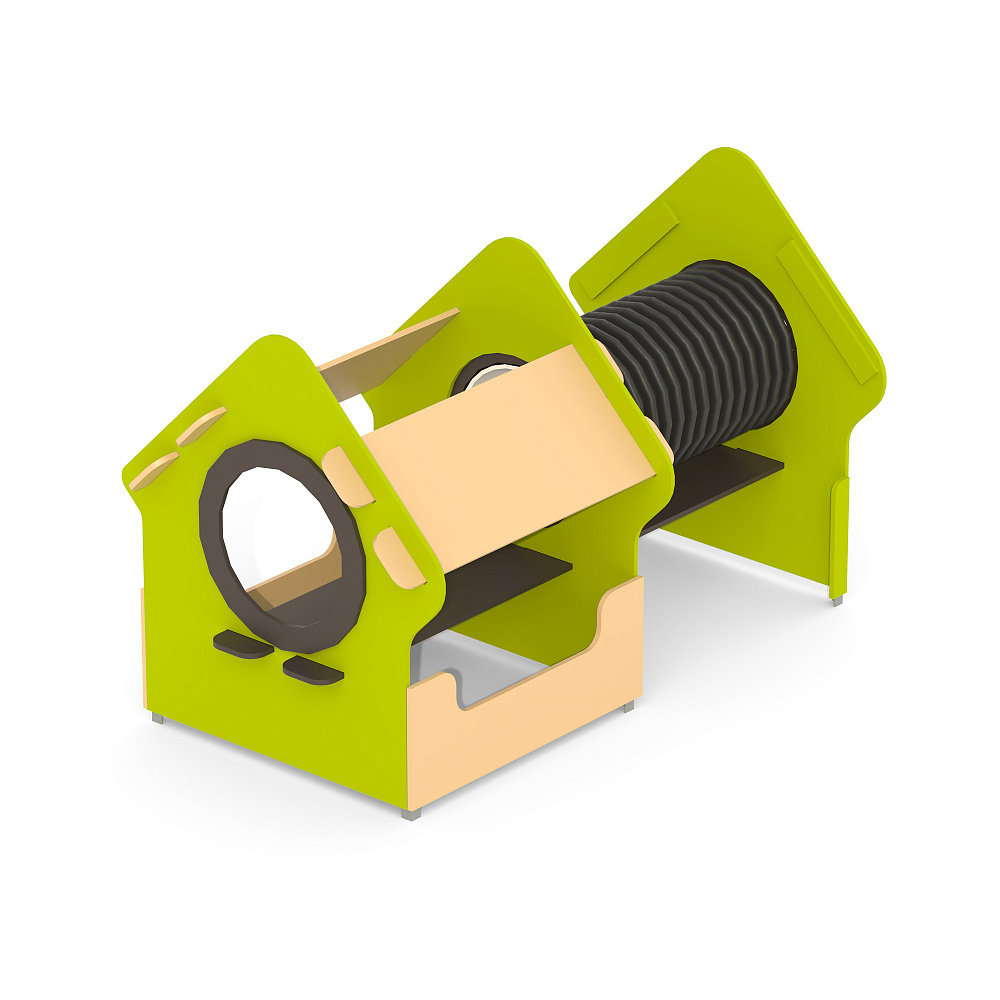 Игровой модуль для тематических игр и физического развития предназначен для детей в возрасте от 4 до 8 лет. Он представляет собой устойчивую конструкцию, обеспечивающую безопасные условия для занятий на открытом воздухе. Основные характеристики включают высокую ударопрочность и виброустойчивость, что гарантирует долговечность и безопасность эксплуатации.В сборе представляет собой конструкцию в виде домика с отверстиями лазами и гофрированной трубой.