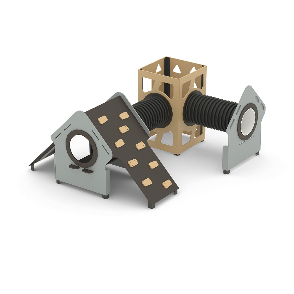 Игровой модуль для тематических игр и физического развития предназначен для детей в возрасте от 4 до 8 лет. Он представляет собой устойчивую конструкцию, обеспечивающую безопасные условия для занятий на открытом воздухе. Основные характеристики включают высокую ударопрочность и виброустойчивость, что гарантирует долговечность и безопасность эксплуатации.В сборе представляет собой конструкцию в виде домика с отверстиями лазами и надстроенными над ними лазами наклонными, соединенного гофрированной трубой с параллепипедом в свою очередь соединенного гофрированной трубой с панелью..