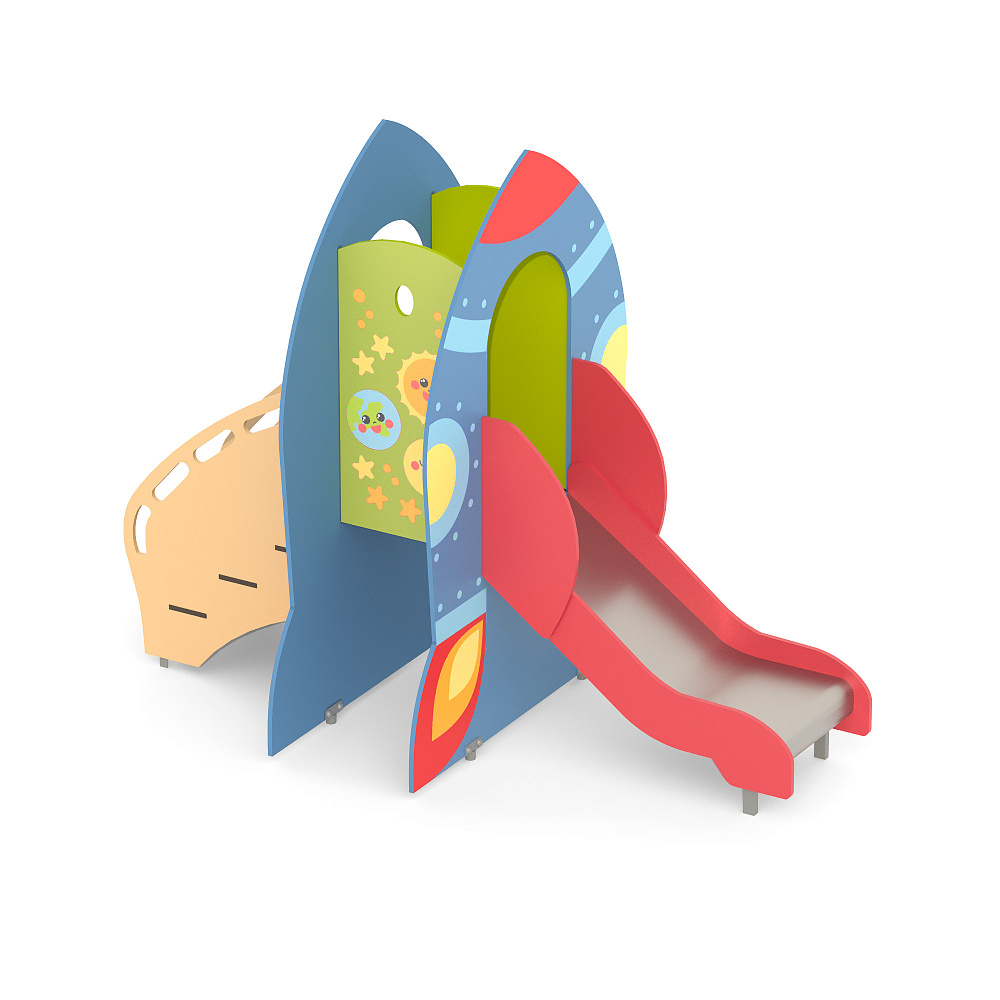 Горка состоит из лестницы входной, с помощью которой можно попасть на площадку с выходом на горку, и горки высотой ската 650 мм. Площадка с двух сторон имеет декоративные ограждения, оформленные в виде ракеты, обеспечивающие безопасное нахождение детей на игровом изделии.