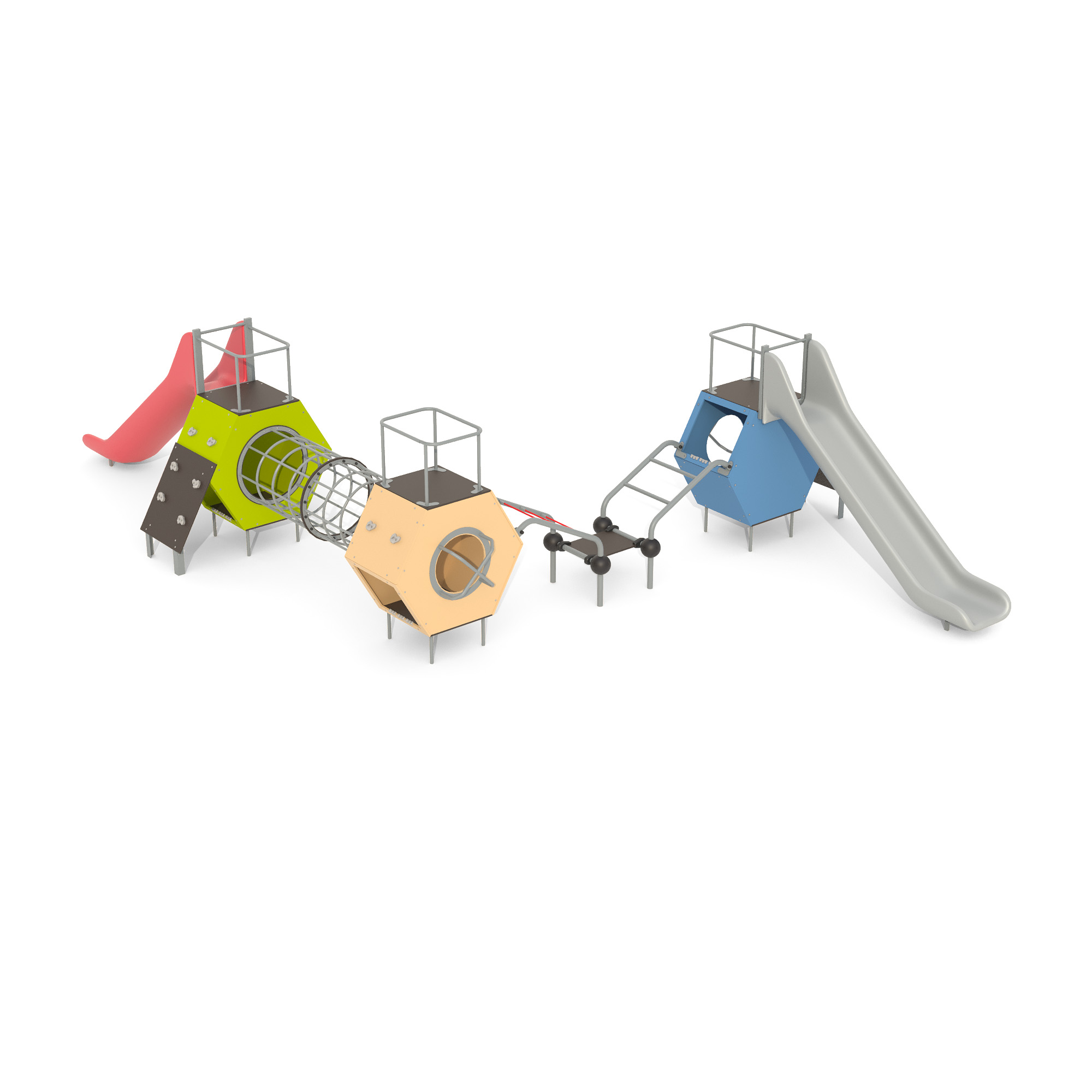 Игровой комплекс Romana 115.84.00 — многофункциональная площадка для детей 7-14 лет. Конструкция размером 9154 x 6503 x 2195 мм состоит из трех объемных шестигранников, соединенных переходами. Комплекс включает: