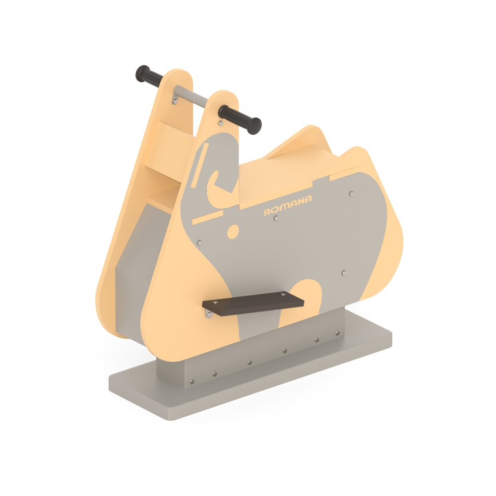 Качалка для тематических игр, предназначена для детей в возрасте от 2 лет. На фигурную вставку при помощи УФ-печати нанесено изображение в тематике «слон». Конструкция качалки предоставляет возможность качаться пользователю по оси «вперед-назад». Изделие приходит в движение за счет переноса веса ребенка - совершения раскачивающих движений «назад-вперед». Платформа обеспечивает плавное легкое качание, без ударов и усилий.