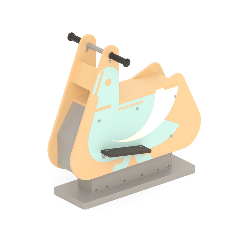 Качалка для тематических игр, предназначена для детей в возрасте от 2 лет. На фигурную вставку при помощи УФ-печати нанесено изображение в тематике «голубь». Конструкция качалки предоставляет возможность качаться пользователю по оси «вперед-назад». Изделие приходит в движение за счет переноса веса ребенка - совершения раскачивающих движений «назад-вперед». Платформа обеспечивает плавное легкое качание, без ударов и усилий.