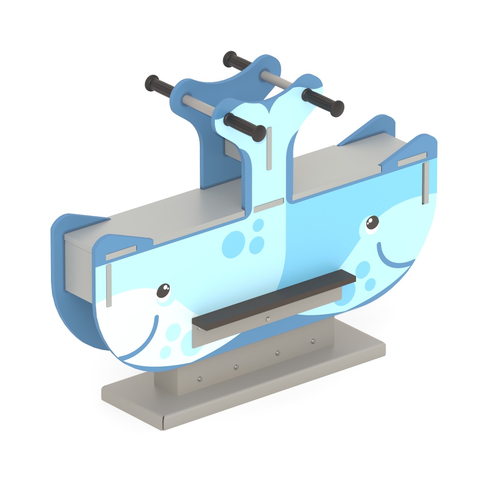 Качалка для тематических игр, предназначена для детей в возрасте от 2 лет, двухместная. На фигурную вставку при помощи УФ-печати нанесено изображение в тематике «киты». Конструкция качалки предоставляет возможность качаться пользователю по оси «вперед-назад». Изделие приходит в движение за счет переноса веса ребенка - совершения раскачивающих движений «назад-вперед». Платформа обеспечивает плавное легкое качание, без ударов и усилий.