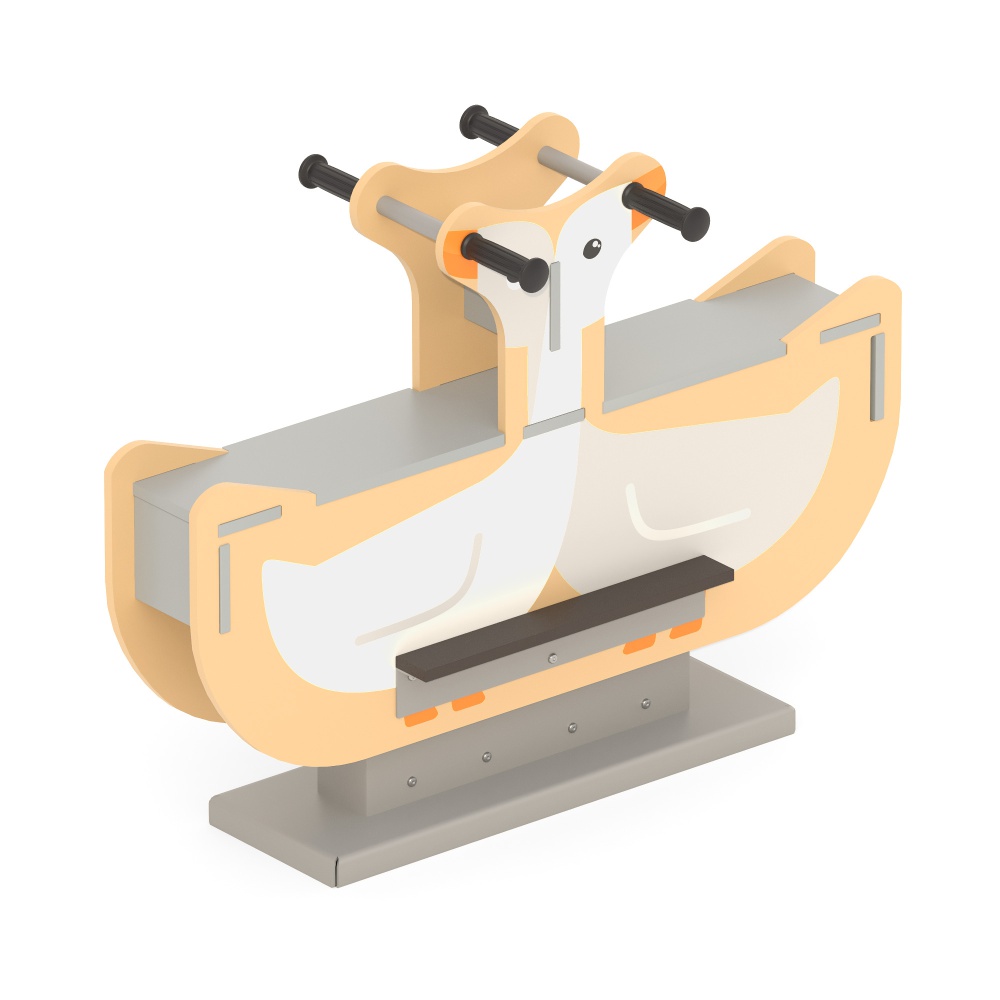 Качалка для тематических игр, предназначена для детей в возрасте от 2 лет, двухместная. На фигурную вставку при помощи УФ-печати нанесено изображение в тематике «гуси». Конструкция качалки предоставляет возможность качаться пользователю по оси «вперед-назад». Изделие приходит в движение за счет переноса веса ребенка - совершения раскачивающих движений «назад-вперед». Платформа обеспечивает плавное легкое качание, без ударов и усилий.