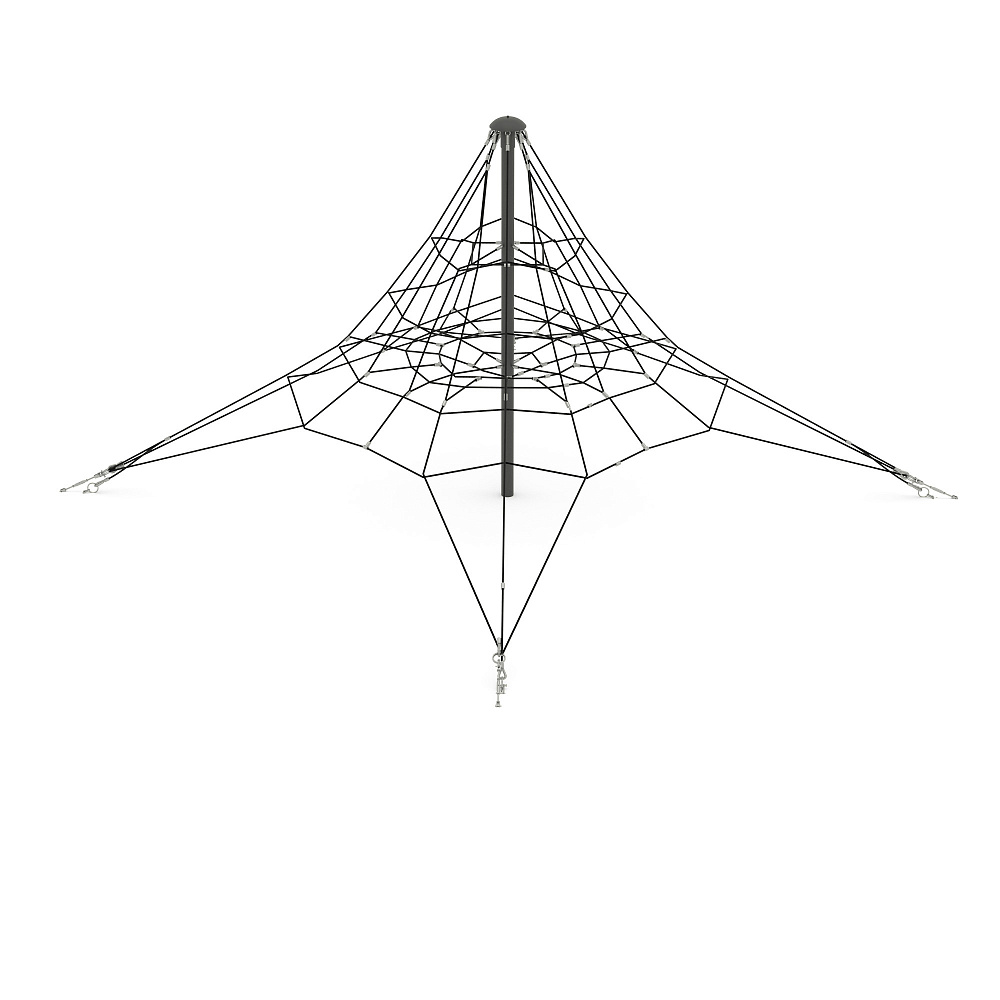 Данное оборудование разработано для комплексного развития детей в возрасте от 8 до 12 лет и может использоваться в любое время года. Лаз представляет собой пирамидальную конструкцию, включающую центральную стойку, к которой крепится канатная сетка или канаты. Для надежности и возможности регулировки натяжения канатов они закрепляются с помощью талрепов и фиксируются на земле.