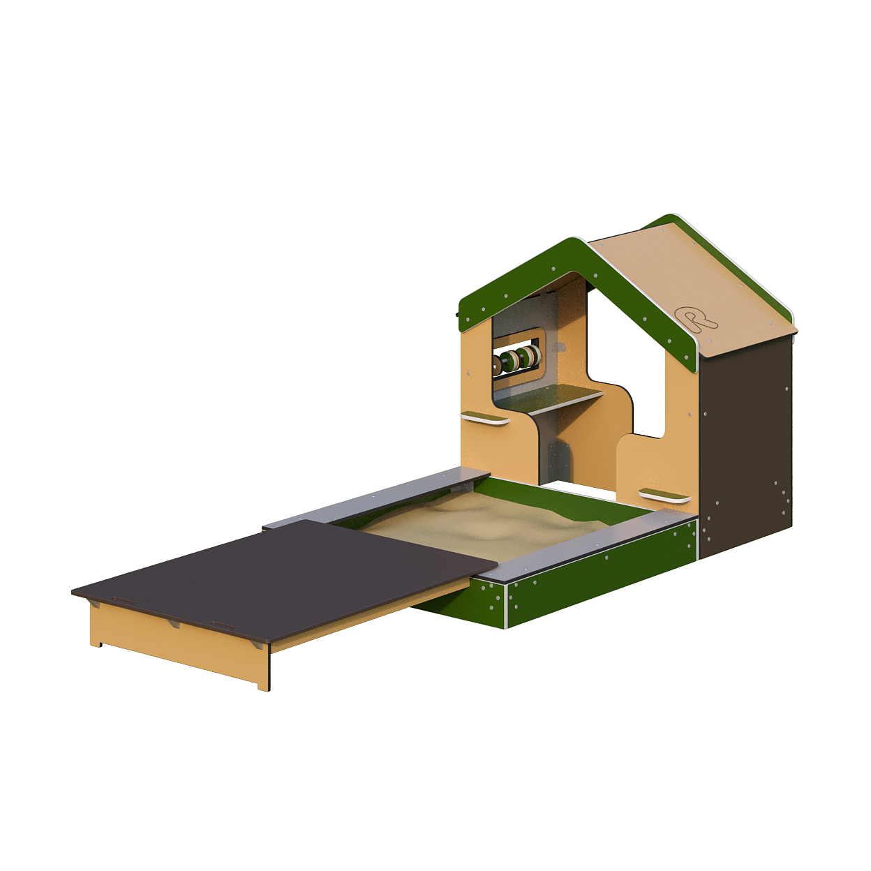 Детская песочница в форме домика выполнена из прочных пластиковых и металлических материалов. Она оснащена бортиками и удобными сиденьями для комфортной игры детей на свежем воздухе. Она полностью безопасна, включая ударопрочность и виброустойчивость. Использование песочницы исключает риск травм или застревания частей тела. Антивандальные элементы и закругленные края обеспечивают надежность и долговечность. Для установки песочница крепится анкерными болтами или монтируется методом бетонирования. Металлические части покрыты антикоррозийной полимерной эмалью, а выступающие соединения закрыты пластиковыми заглушками для предотвращения повреждений. Необычная форма и стильное цветовое решение делают песочницу универсальным элементом любой игровой площадки.