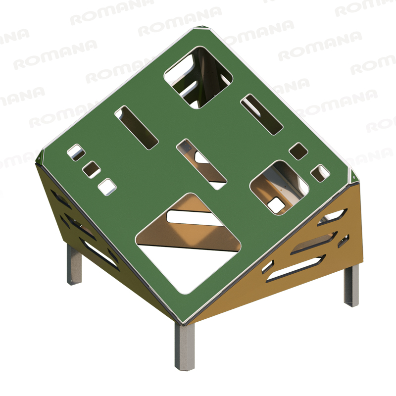 Romana 115.34.10 – детский игровой комплекс, предназначенный для оборудования площадок для дошкольников. Конструкция изготавливается из прочного пластика (ПНД). Пластиковые детали имеют толщину не менее 19 мм. Игровой комплекс обладает повышенной ударопрочностью и устойчивостью. Данное оборудование изготавливается согласно ГОСТ Р 52 169 – 2012. Формы деталей изделия и конфигурация отверстий позволяют обеспечить безопасность использования и избежать травм. Металлические детали конструкции изготовлены из стали толщиной 2,5 мм. Устанавливается конструкция с помощью грунтозацепов. Все детали (металлические и пластиковые) покрыты порошковой краской, что увеличивает время эксплуатации изделия. Игровой комплекс расширяет функциональные возможности детской площадки, у детей появляется больше тем для игр, развития ловкости и внимания.