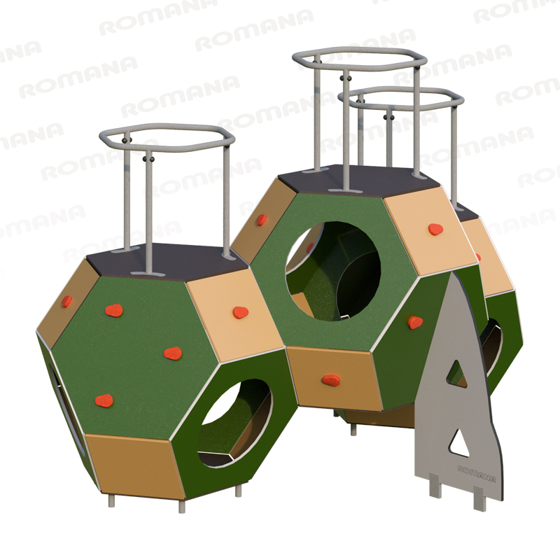Romana 115.17.10 – игровой комплекс для возрастной группы 8-12 лет. Игровая конструкция состоит из трех усеченных октаэдров, ограждения и панели «упор». Крепится в грунт с помощью грунтозацепа и бетонируется. Игровой комплекс надежный, устойчивый и безопасный. Его шестигранные панели ударопрочные, выполнены из качественного пластика (ПНД) толщиной 19 мм. Все другие детали также изготовлены из пластика (ПНД) толщиной 19 мм. Наверху каждого октаэдра имеются пластиковые приспособления для лазанья. Игровой комплекс может устанавливаться во дворах домов, на игровых площадках, на территории торгово-развлекательных комплексов. Можно эксплуатировать круглогодично – при соблюдении техники безопасности и под контролем взрослых.