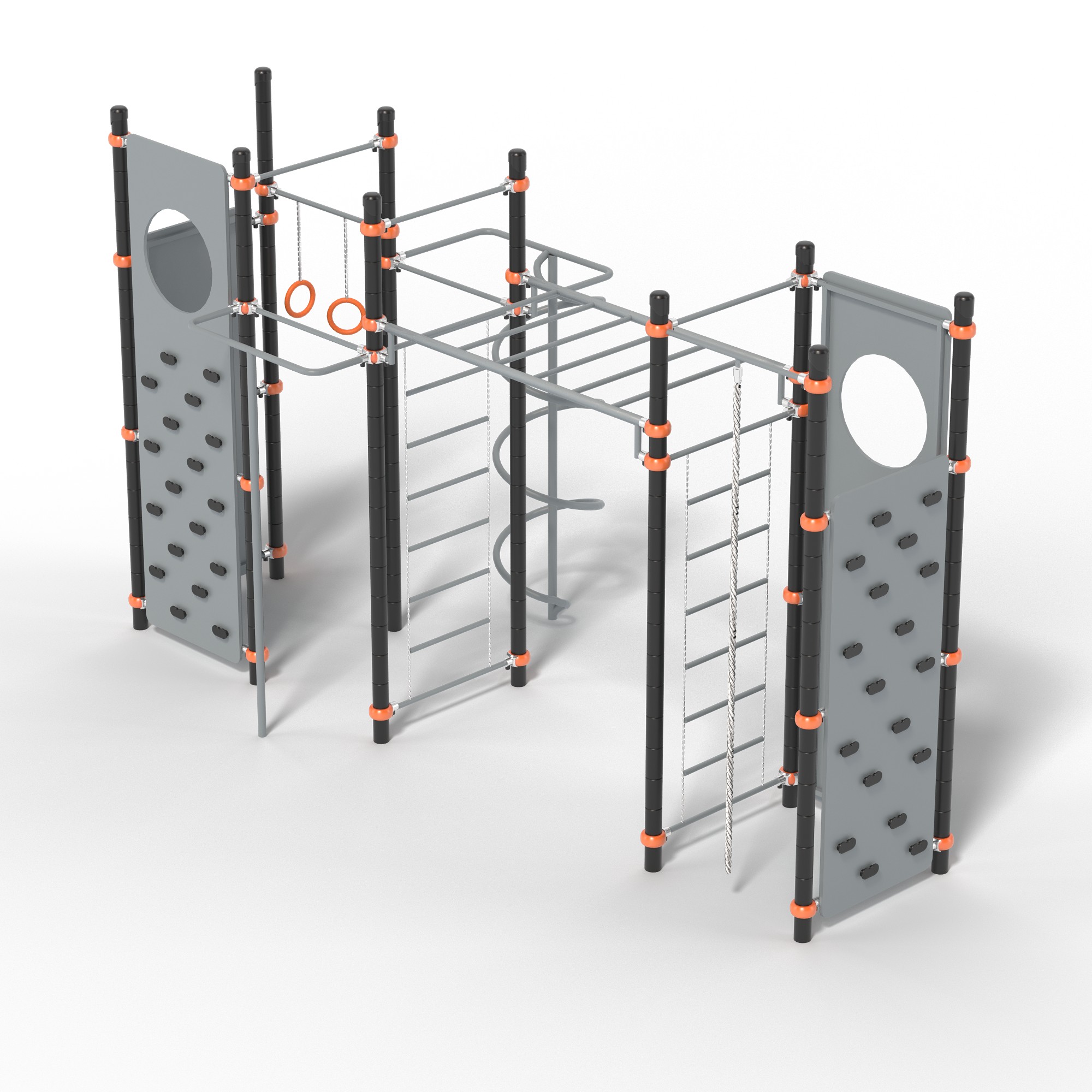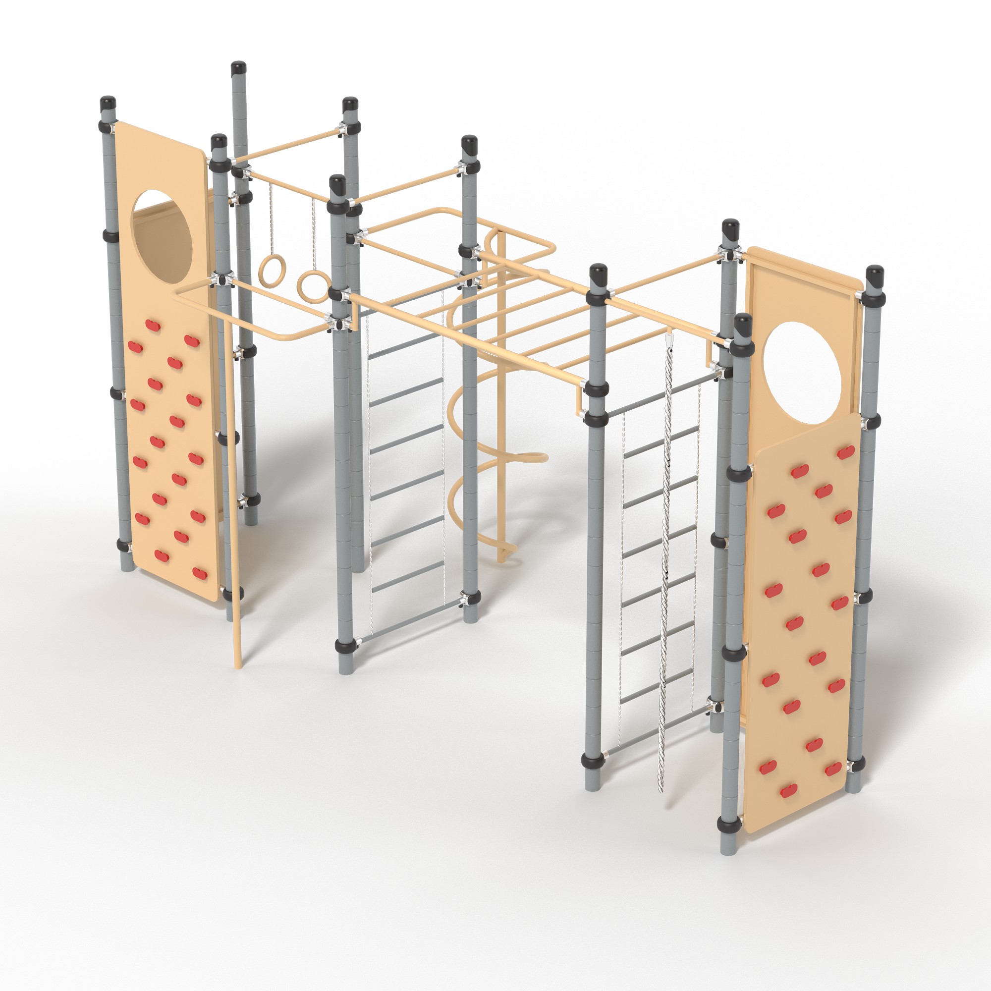 Спортивное оборудование предназначено для установки на территориях игровых зон, зон отдыха, спортивных площадках. Может эксплуатироваться круглогодично. Предназначено для доступных занятий физической культурой на свежем воздухе. Представляет собой сборно-разборную конструкцию прямоугольной формы, состоящую из восьми стоек, между которыми должны быть закреплены лаз-змейка, цепной однорядный лаз, лаз-скалолаз, кольца гимнастические, трехступенчатая лестница, семиступенчатая шведская стенка, два турника. Изделие устанавливается на открытых уличных участках, находящихся под контролем ответственного лица – эксплуатанта. Установка должна проводится на ровной площадке, свободной от насаждений. В зоне безопасности должно быть ударопоглощающее покрытие (песок, древесные опилки) минимальной толщиной 300 мм.