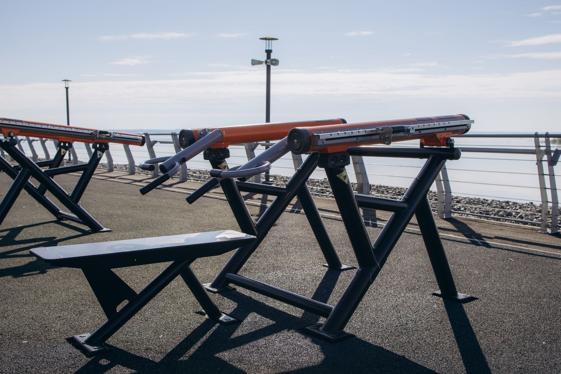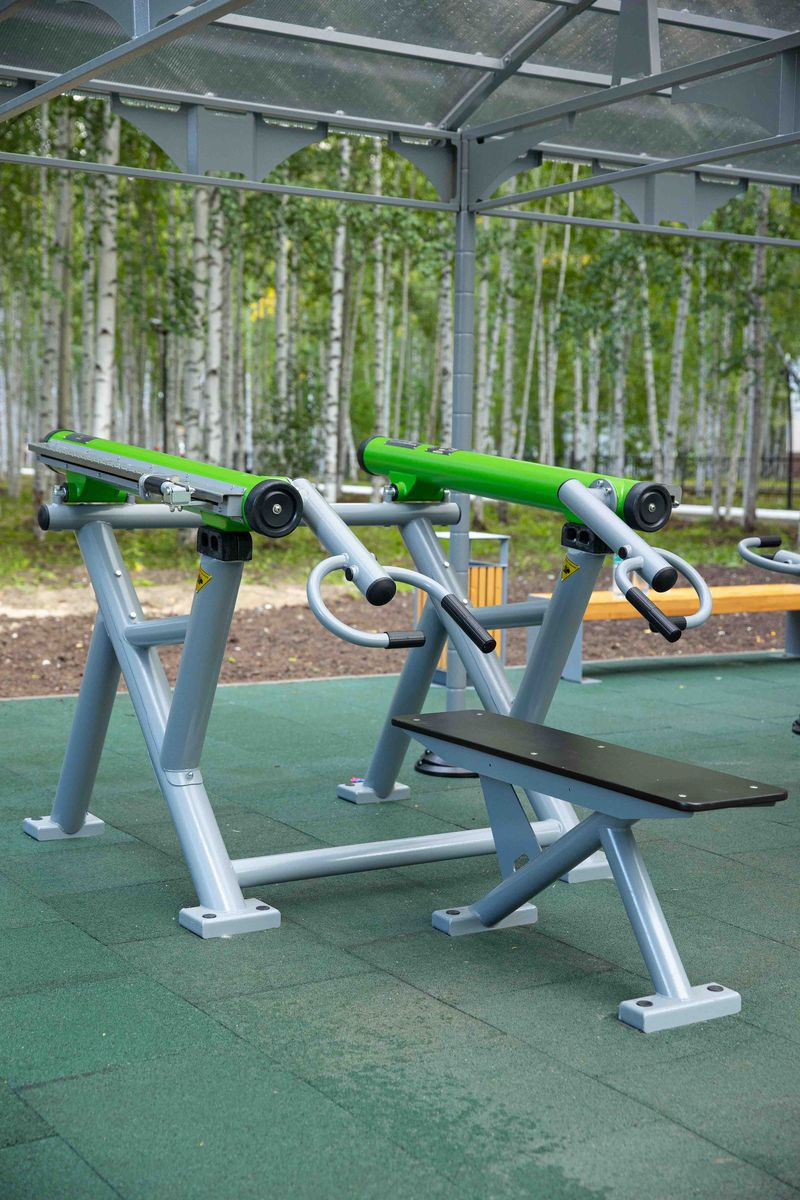 Уличный силовой тренажер для выполнения базового упражнения «Жим штанги в положении лежа на скамье». Его задача — прокачка, увеличение объема, снижение жировой прослойки, проработка рельефа большой и малой грудных мышц. При этом, в зависимости от того, какие виды упражнений, хват и вес применены, задействуются плечевой пояс, кисти рук и пальцы, трицепсы, передние пучки дельтовидных и широчайшие мышцы спины.